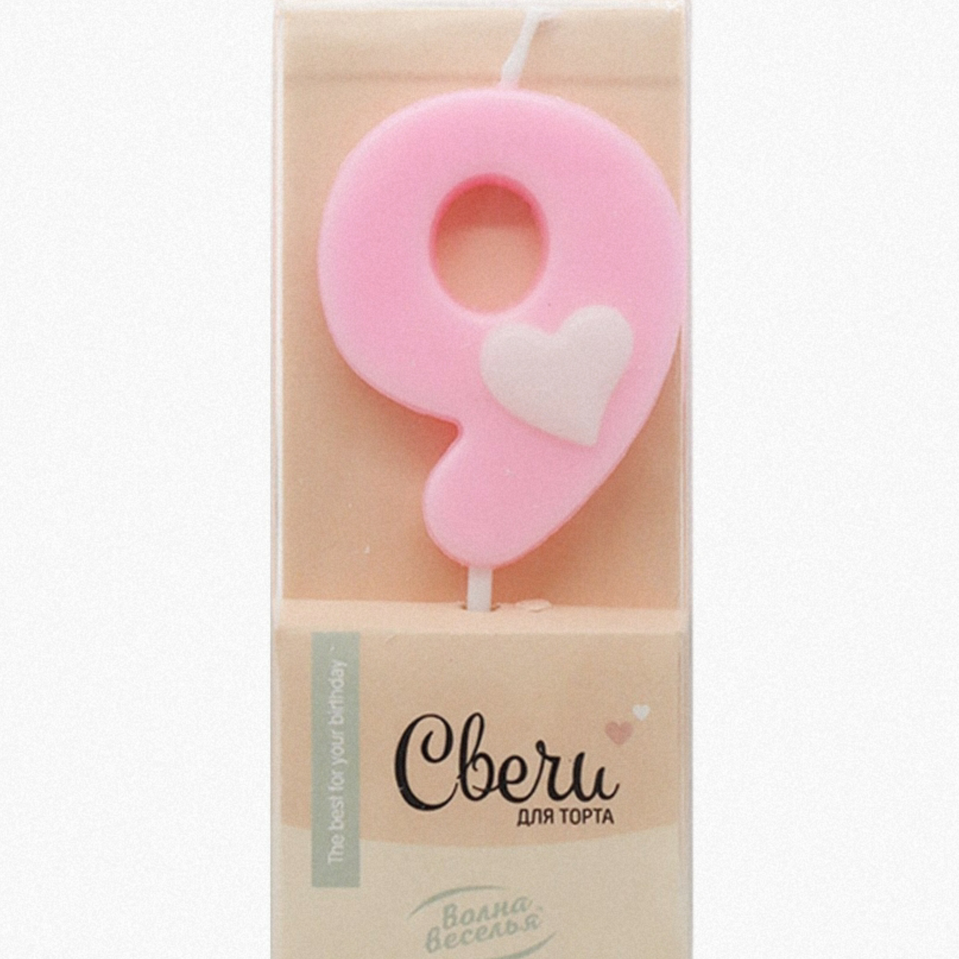 Свеча-цифра Розовая с белым сердечком "9" (ТМ "Волна веселья", Китай)